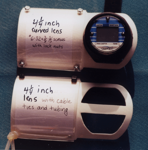 I wanted a way to simplify reusing and preserve the schedules. Locating the deco schedule next to my bottom timer where it could be easily read was paramount. Many divers secure their schedule with tape but something more substantial was desired. Experiments with Plexiglas were encouraging. All the Plexiglas I used were scraps from a window business and free. I discovered Plexiglas can be heated and shaped quite easily. For this operation first cut a piece of Plexiglas to fit your slate and smooth rough edges with a bench grinder. Bevel the top four corners to reduce the raised point. Preheat your kitchen oven to about 150 degrees Fahrenheit. Make it too hot and the Plexiglas will develop bubbles. Locate the oven shelf on a low middle track, not on the bottom. Place a sheet of aluminum foil on the shelf for the Plexiglas to lay on. After placing the Plexiglas in the oven, watch it closely. You want to make it pliable, not melt it. Better to try shaping it too early than make it too soft. You can always put it back in the oven but you can't remove bubbles and discoloration caused by too much heat.